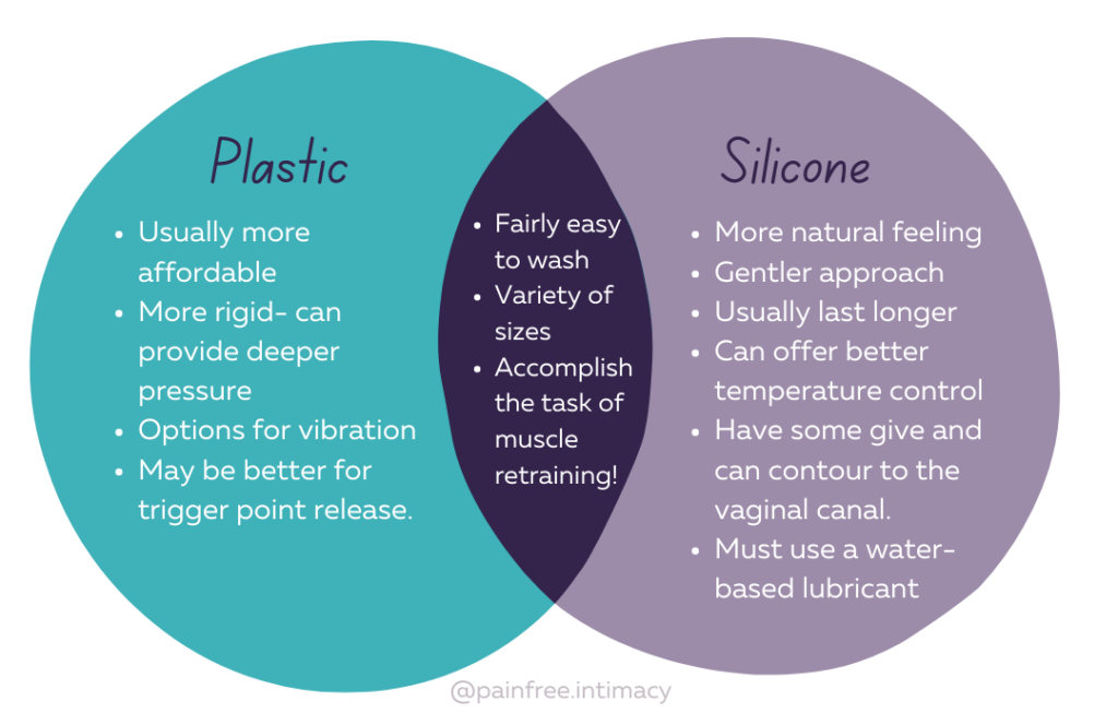 They can be a little too intense: Because they’re not as yielding, plastic dilators can be a bit firm for more tender pelvic floor muscles. If you’re using plastic dilators, just be aware of this and try to exercise a bit more gentleness in applying pressure.